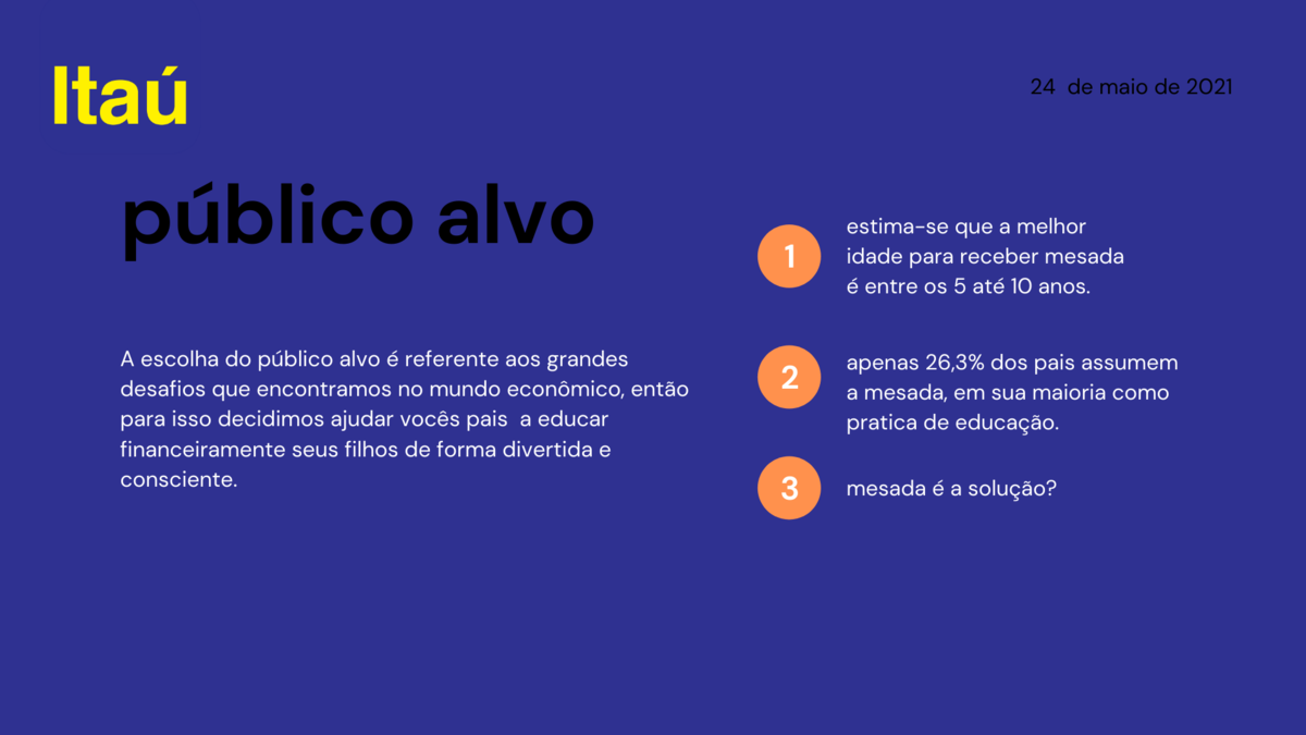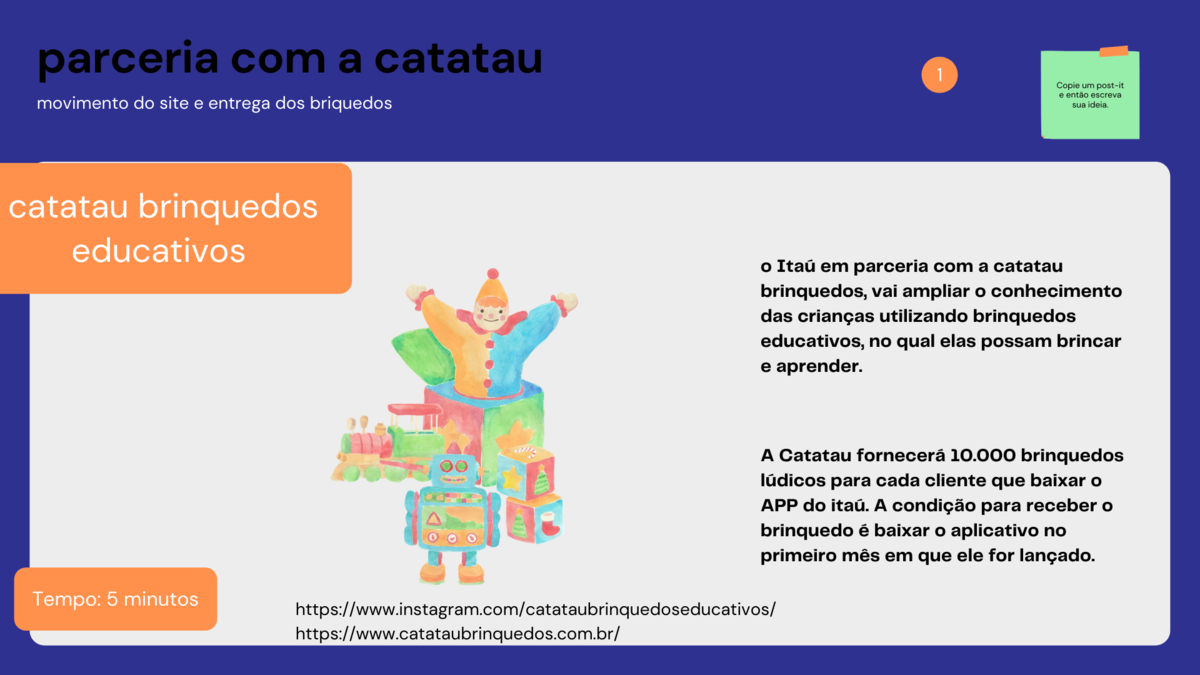 Itaú promove ação de educação financeira para crianças em parceria com a loja Catatau. Lançará um APP voltado para as crianças onde seus responsáveis depositarão dinheiro nesse APP. Cada cliente que baixar o APP irá ganhar um brinquedo lúdico da Catatau! Nós faremos uma ação de promover essa parceria entre o Itaú e a empresa Catatau, que está buscando criar brinquedos que promovam uma educação financeira para crianças. No entanto, ela precisa de parceria e dar início ao projeto que já vem sendo idealizado. A condição para receber o brinquedo é baixar o aplicativo no primeiro mês em que ele for lançado.
